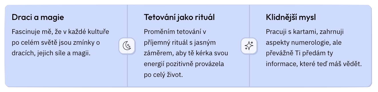 Ale je a bude pro mě důležité to, aby ses při spolupráci se mnou cítil/a dobře, abychom si společně určili záměr tvého tetování - protože tě bude provázet na tvé cestě do konce tvého života. Záměr může být jakýkoliv, přitáhnutí hojnosti, femininity/maskulinity, nebo jen jako připomínka něčeho, co ti dělá radost.